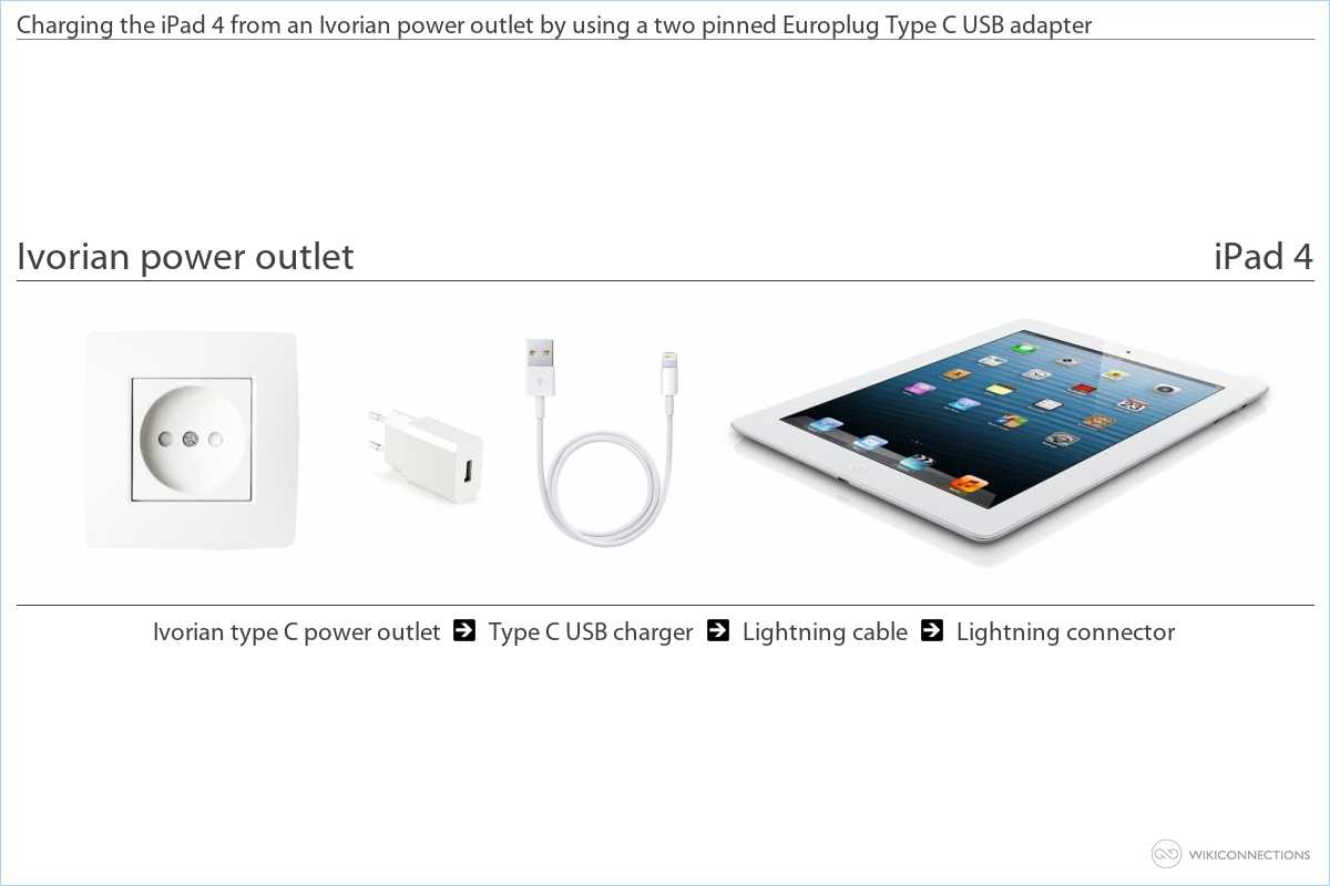 - In order to power your iPad 4 from an Ivorian power outlet you'll need a Type E USB power plug adapter [7] and a USB to Apple Lightning cable [5] (Apple usually include this USB cable with the iPad 4).