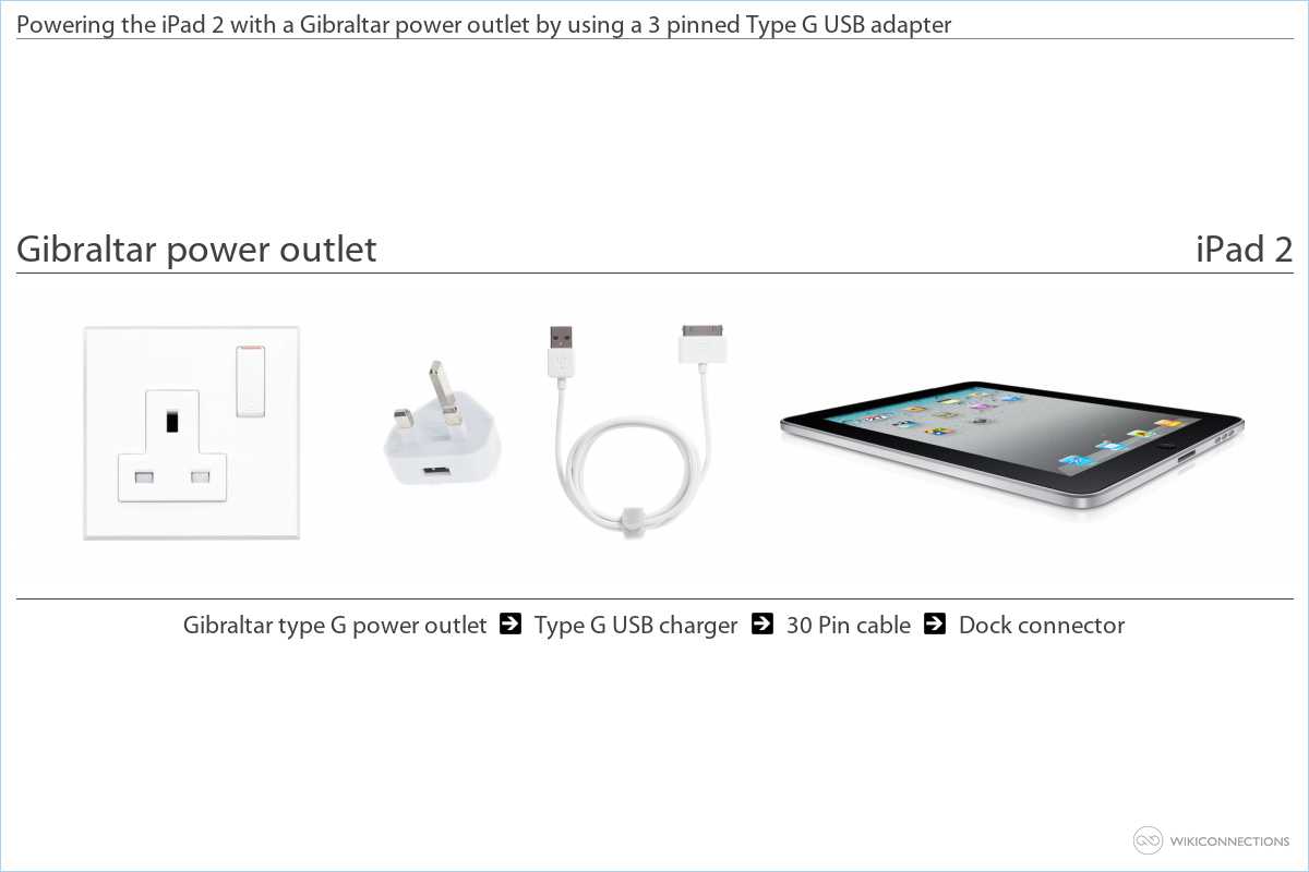 - If you want to supply power to the iPad 2 from the Gibraltar power outlet you'll need a Type G USB power plug adapter [4] and a USB to Apple 30 pin cable [5] (the cable is typically included with the iPad 2 by Apple).