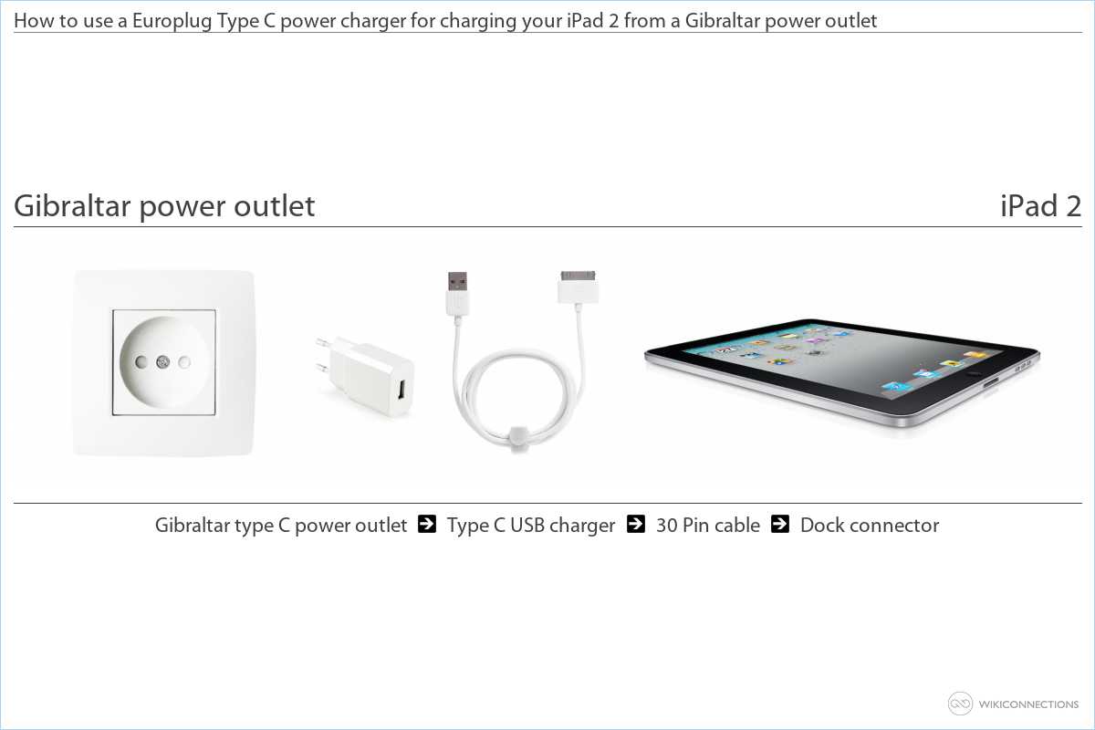 - In order to charge your iPad 2 using a Gibraltar power outlet you'll need to use a Type C USB power plug adapter [7] and a USB to Apple 30 pin cable [5] (usually already included with your device by Apple).