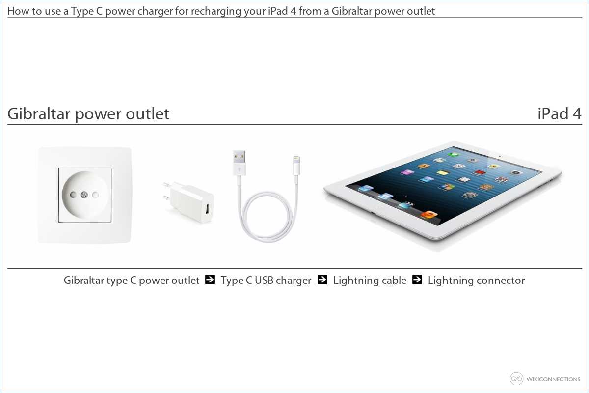 - To supply power to the iPad 4 using a Gibraltar power outlet you will need to buy a Type G USB power plug adapter [4] and a USB to Apple Lightning cable [5] (Apple should usually supply this cable with your iPad 4).