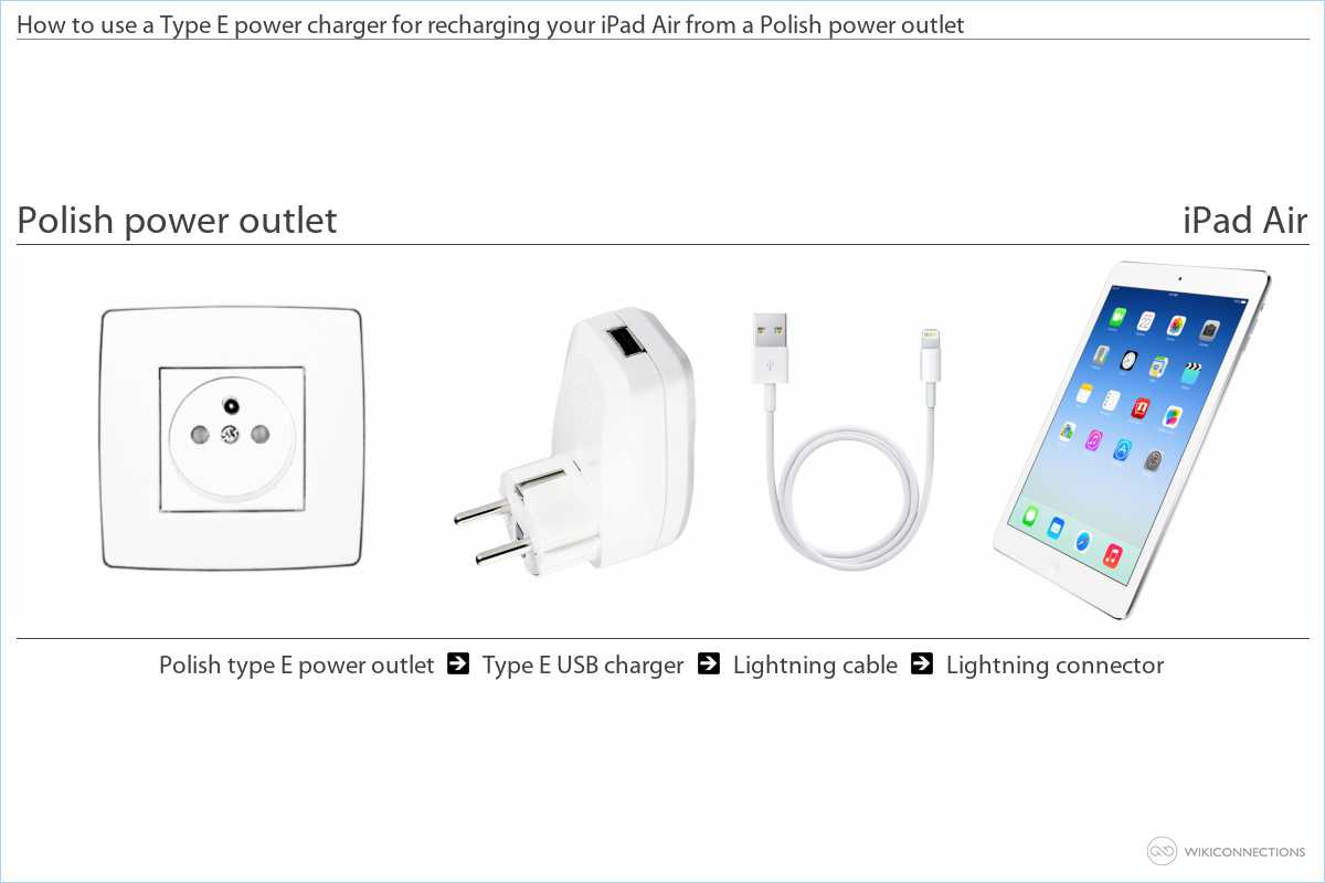 - In order to supply power to your iPad Air from a Polish power outlet you'll need a Type E USB power plug adapter [7] and a USB to Apple Lightning cable [5] (Apple should typically include this USB cable when you buy your iPad Air).