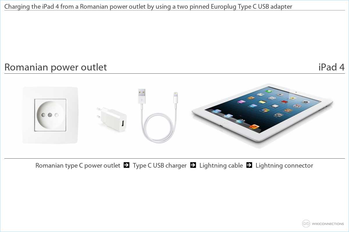 - If you want to power your iPad 4 using a Romanian power outlet you will need a Type C USB power plug adapter [4] and a USB to Apple Lightning cable [5], Apple normally include the USB cable with your iPad 4.