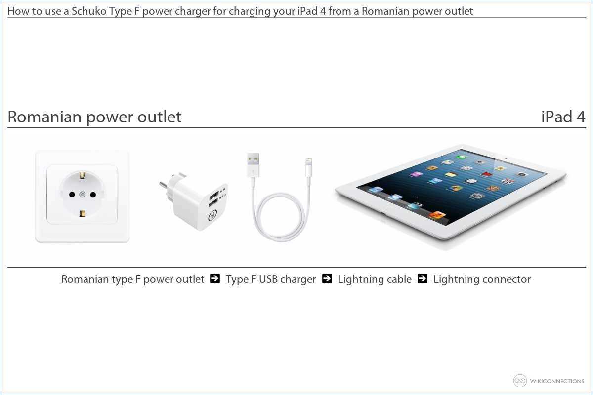 - If you want to power the iPad 4 from the Romanian power outlet you'll need to use a Type F USB power plug adapter [7] and a USB to Apple Lightning cable [5] - Apple should usually supply this cable when you first purchase the iPad 4.