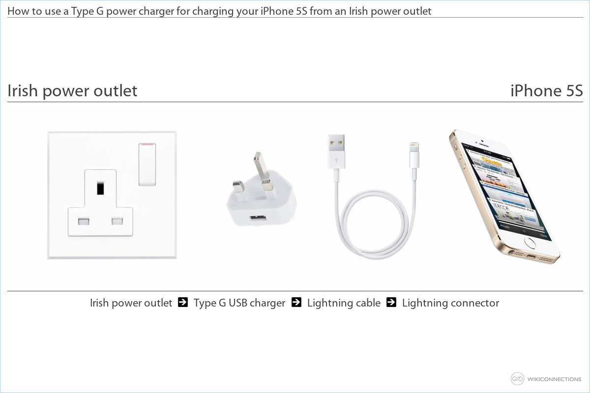 - In order to supply power to your iPhone 5S from an Irish power outlet you'll need to buy a Type G USB power plug adapter [4] and a USB to Apple Lightning cable [5] - Apple should normally supply this USB cable with the iPhone 5S.