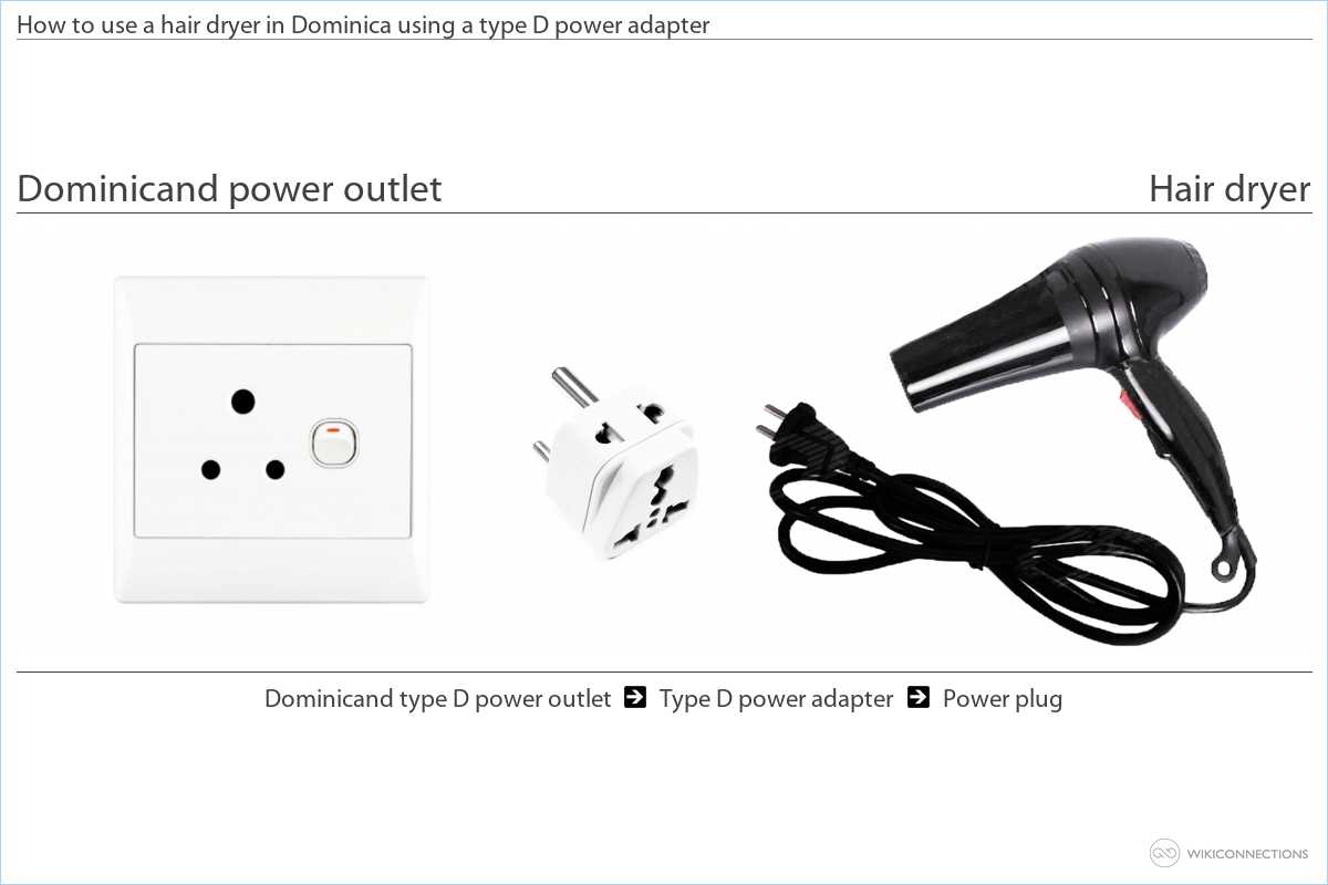 - If the plug shape on your hair dryer isn't the same type of outlet used in Dominica you will need to bring a Type D power adapter [4]. The power adapter will convert plugs from other countries for a power outlet in Dominica by changing the shape of the plug, but it doesn't change the voltage of your hair dryer to work with a 230 volt outlet.